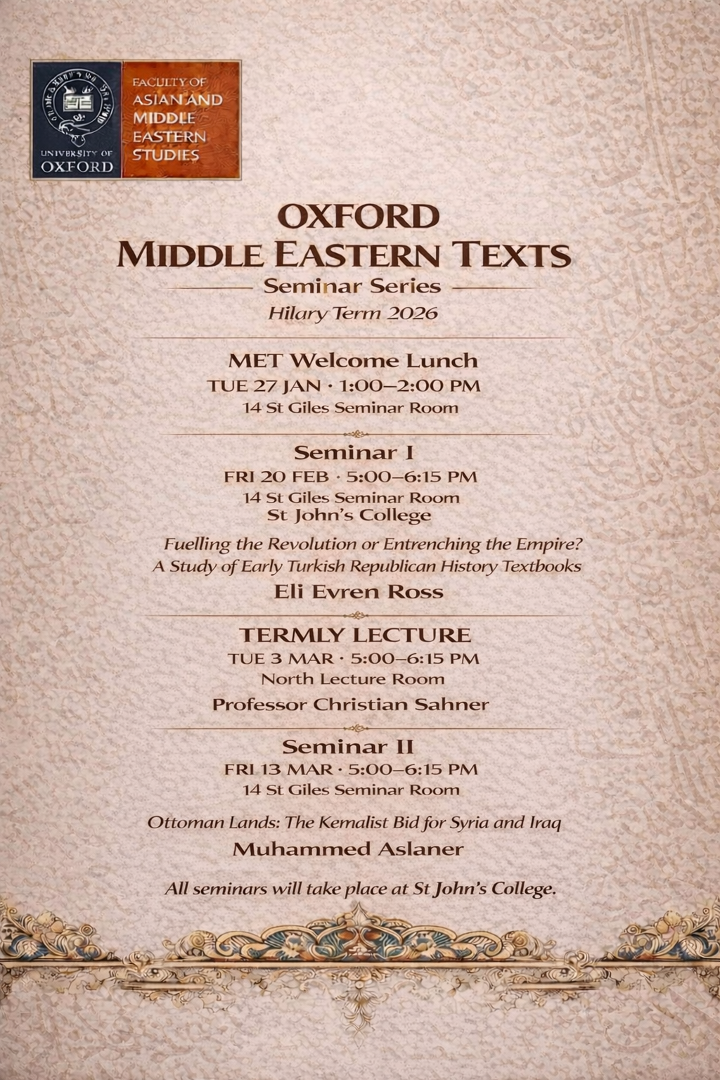 The MET Salon is a student-led network for DPhil and MPhil students working on the Arabic-script textual world, including Arabic, Persian, Ottoman Turkish, Urdu, Hebrew/Judeo-Arabic, and related traditions. The Salon hosts monthly seminars and a termly guest lecture, providing an interdisciplinary forum for discussion and exchange across periods and regions.